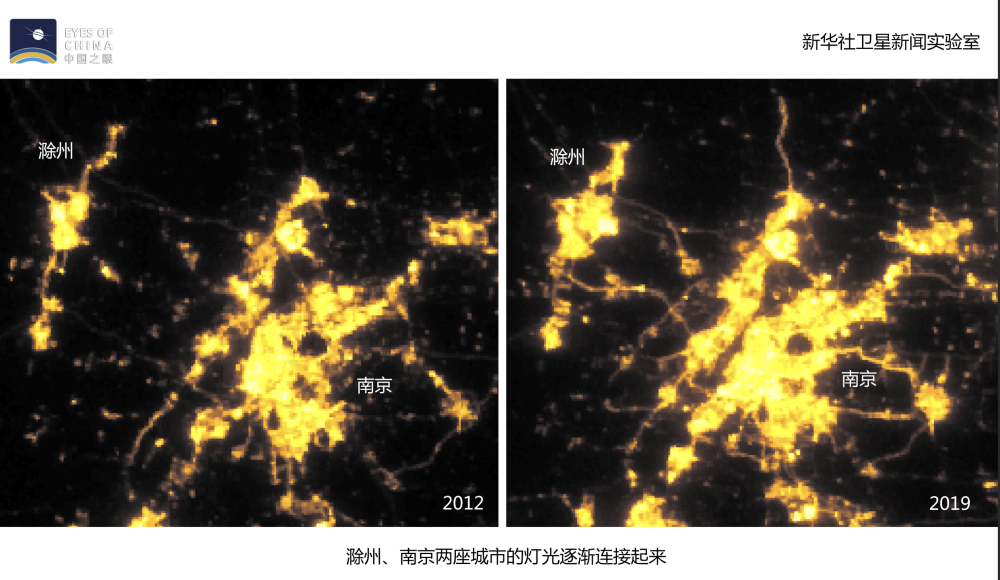 滁州,地处皖东,与南京相邻。从2012年至2019年,这两座城市的光亮边缘不断延伸,直至逐渐融合,“你中有我,我中有你”。数据显示,滁州市灯光亮度值7年间约增加112%。