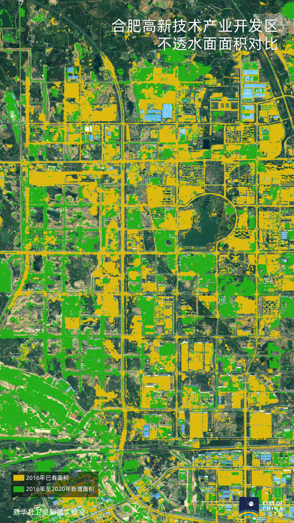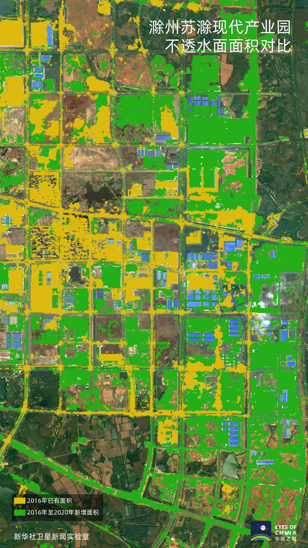黄色覆盖区域为2016年已有不透水面区域,绿色为2020年较2016年新增区域。大幅增加的绿色显示,滁州和合肥的工业园区范围在快速向外延伸,经济发展迈上新台阶。