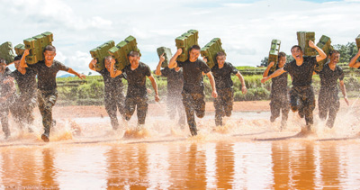 中队官兵扛着弹药箱在泥水中训练冲刺。本报记者 金 歆摄