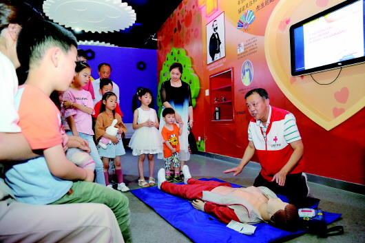 闵华在湖州市科技馆为青少年及家属讲解演示心肺复苏和AED操作。 受访者供图
