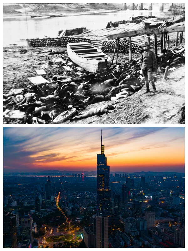 上图为1937年12月中旬,日本侵略军攻占中国南京后,对中国老百姓进行了空前的惨无人道的大屠杀。在南京城西一条流往长江的小河边,被日本侵略军杀害的中国人,尸体遍地血流成河。