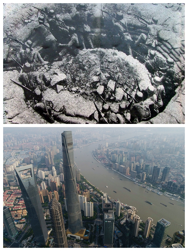上图为1937年8月13日至11月12日,中日军队进行淞沪会战,这次会战粉碎了日本军国主义者速战速决的迷梦。这是中国军队88师在上海闸北的环形工事里同日军巷战。