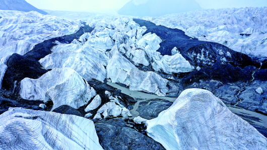 ▲这是8月15日拍摄的岗加曲巴冰川(无人机照片)。本报记者吴刚摄