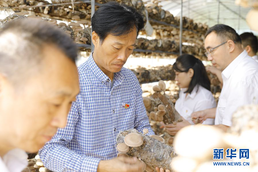在第一书记郭旗(左二)的动员下,2019年9月,中国铁路西安局集团有限公司西安供电段党员、干部到唐湾村帮助村民采摘丰收的香菇。新华网发(西安供电段驻唐湾村扶贫工作队供图)