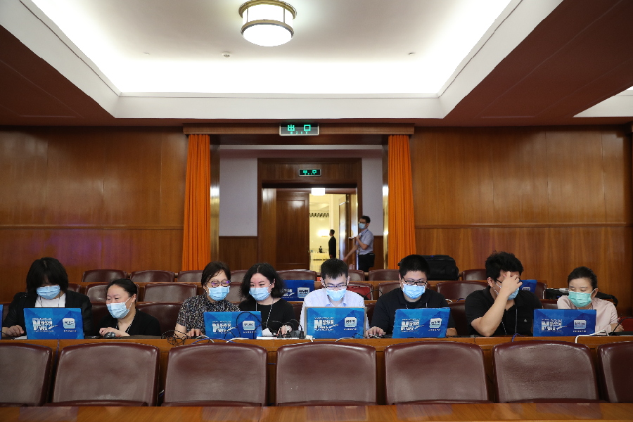 全国抗击新冠肺炎疫情表彰大会于9月8日上午10时在北京人民大会堂隆重举行。新华网直播团队正在进行准备工作。(新华网 翟子赫 摄)