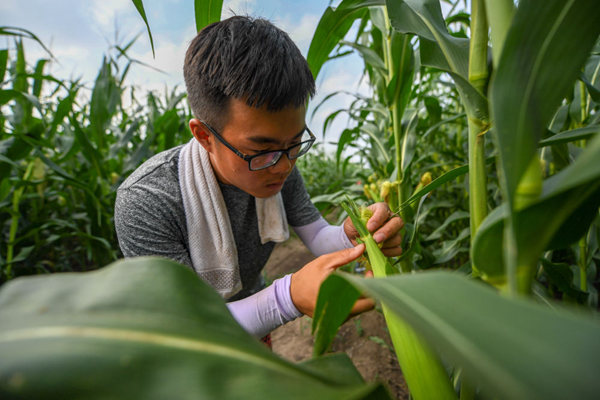 在吉林省梨树县四棵树乡三棵树村的“科技小院”试验田,中国农业大学在读硕士沙野查看玉米长势(2019年7月24日摄)。新华社记者 张楠 摄