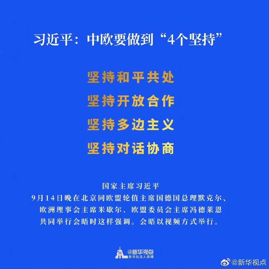国家主席习近平9月14日晚在北京同欧盟轮值主席国德国总理默克尔、欧洲理事会主席米歇尔、欧盟委员会主席冯德莱恩共同举行会晤,会晤以视频方式举行。
