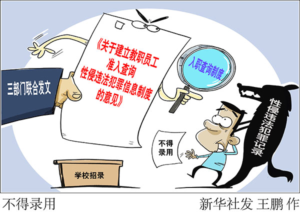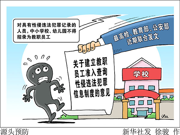 新华社北京9月18日电(记者陈菲)为加强对性侵未成年人犯罪的源头预防,最高检、教育部、公安部近期联合发文,要求在全国建立入职查询制度,对具有性侵违法犯罪记录的人员,中小学校、幼儿园不得录用,教师认定机构不得认定教师资格。