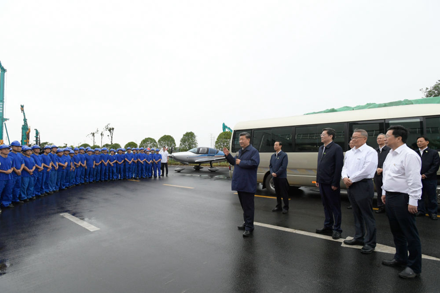 9月17日下午,习近平在长沙市山河智能装备股份有限公司生产车间,察看装备制造流程,了解技术研发、生产制造情况。(新华社记者李学仁 摄)