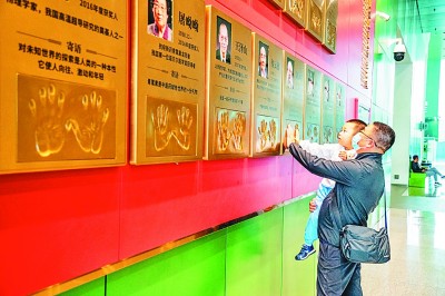 上下图均为观众在中国科技馆参观“国家最高科学技术奖获奖科学家手模墙”。中国科技馆供图