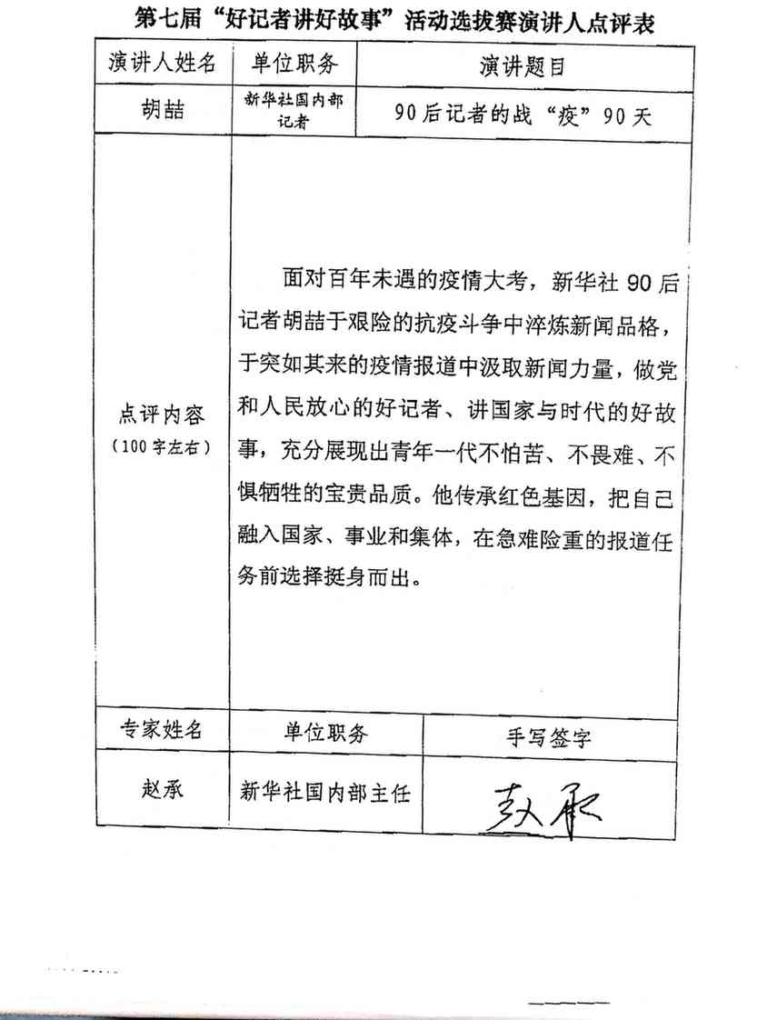 新冠肺炎疫情在武汉暴发以来,胡喆同志第一时间前往武汉支援采访,并在武汉坚守三个月,采写了《同舟共济战“疫”记》《壮哉,大武汉》《赤子之歌》《青春的力量 时代的脊梁》等多篇稿件,全面记录了中国人民抗击新冠肺炎疫情的全过程。参加新闻工作以来,胡喆同志采写的《“探月梦”托举“中国梦”》等一批反映中国重大科技创新突破和进展的稿件多次获评新华社优秀新闻作品奖、中国科技传播奖。2019年10月被六部委联合授予“探月工程嫦娥四号任务突出贡献者”称号,2020年9月被中共中央、国务院、中央军委授予“全国抗击新冠肺炎疫情先进个人”荣誉称号。