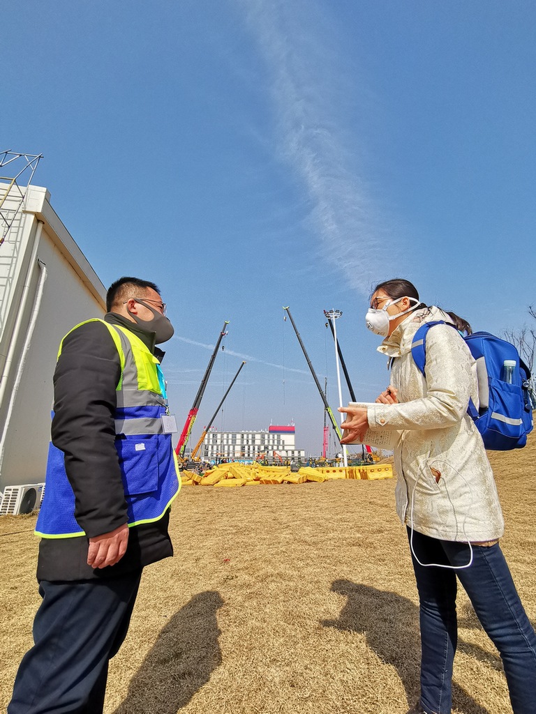2020年1月31日,经济日报记者乔申颖在武汉雷神山医院建设工地采访