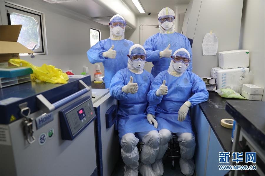 军事科学院军事医学专家组成员在实验室内为武汉加油鼓劲(5月12日摄)。新华社发(张振威 摄)