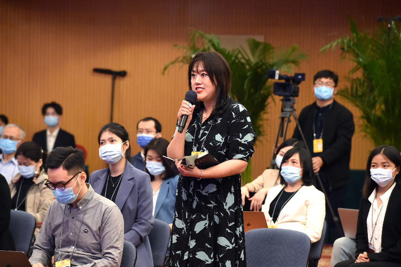 图为记者在十二届全国人大四次会议记者会上提问