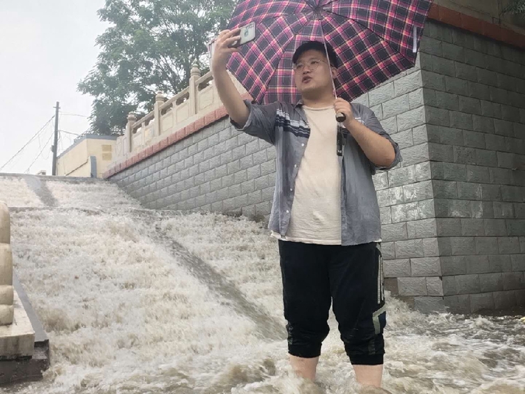 2020年6月石家庄雨季,在街头通过手机直播报道石家庄路况、降雨情况等
