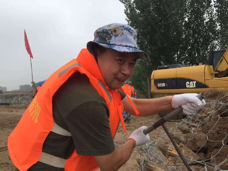 今年7月1日在开封黄河大堤柳园口险工38号坝采访,和党员突击队一起参加抢险施工。图为计亮在抢险时奋力拧紧铅丝笼。