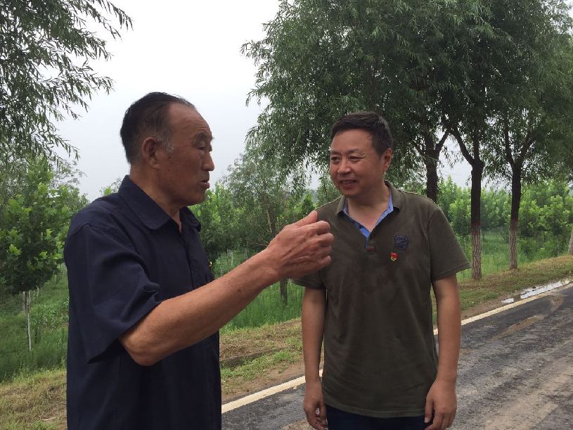今年7月1日在开封黄河大堤柳园口险工38号坝采访,和党员突击队一起参加抢险施工。图为施工间隙计亮在黄河大堤堤顶公路采访故事的主人公张飞的大舅——74岁的老修防工阎庆彦。