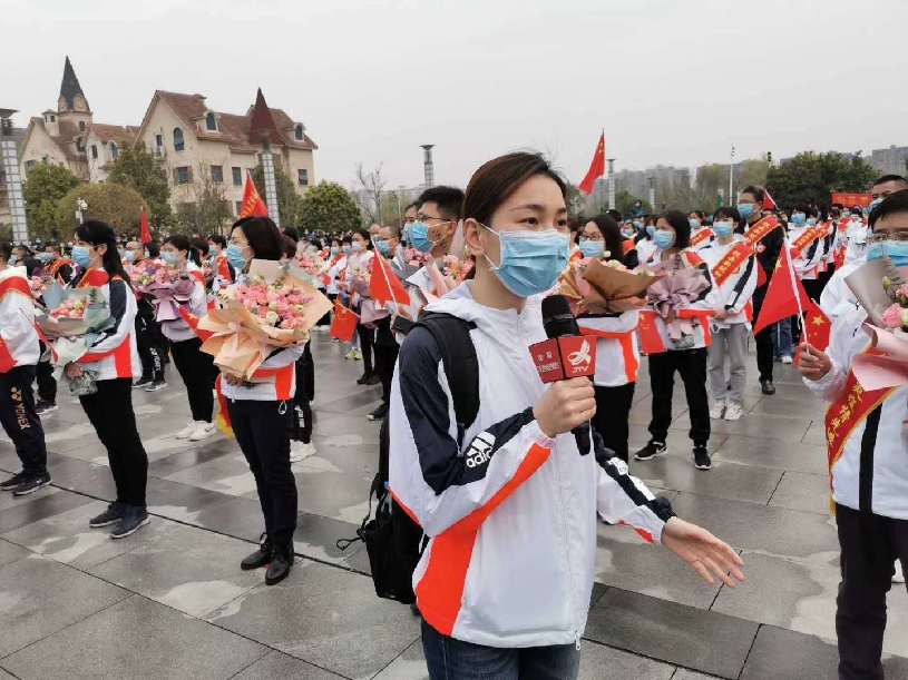 江西广播电视台邹辰馨在援随医疗队返程仪式上采访