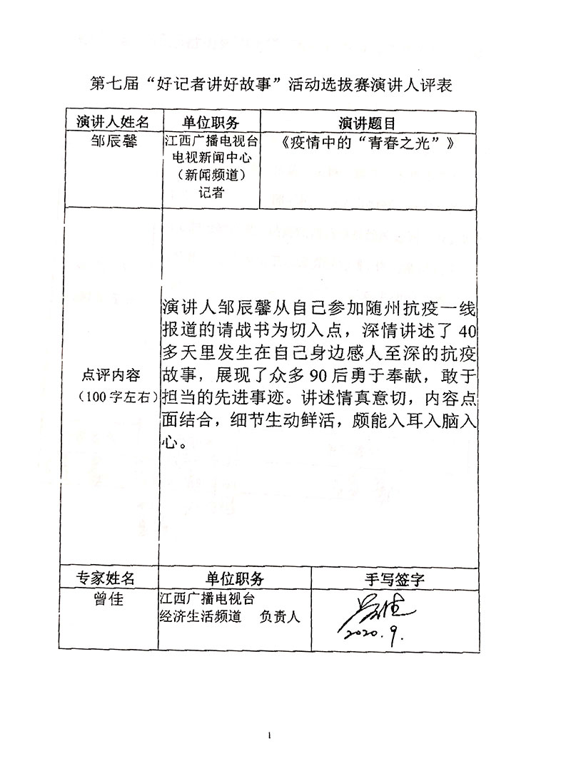 江西电视台电视新闻中心(新闻频道)记者曾任江西卫视《江西新闻联播》记者参与报道 【绿色发展 生态优先】及【聚焦环境保护 督察“回头看”】【江西非物质文化遗产展】等系列活动 2020年春节随江西援随医疗队前往湖北随州,深入疫情一线报道。在多档新闻节目中以出镜记者的方式呈现 鲜活的现场报道. 荣获2020年江西省“好记者讲好故事”演讲赛十佳