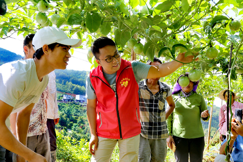 广西隆林各族自治县者徕村第一书记带领贫困户查看百香果长势情况