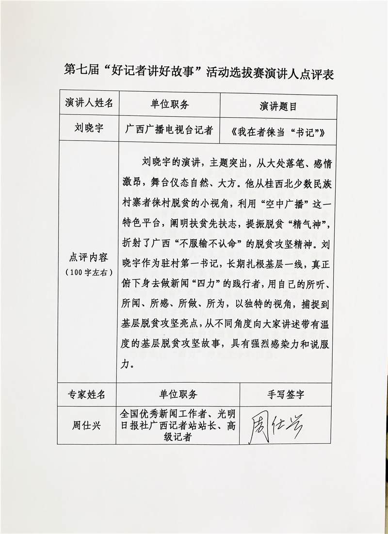 刘晓宇同志,从事新闻采编工作十余年,从基层记者到贫困村党组织第一书记,他先后参与中国共产党第十九次全国代表大会、全国“两会”、新春走基层、重走长征路等大型主题采访报道,能够做到“规定动作不走样,自选动作有创新”,用脚力、眼力、脑力、笔力践行记者的职责和使命。2018年3月,主动申请到隆林各族自治县者浪乡者徕村担任贫困村党组织第一书记。该同志采写的《寻贫日记》、《赤子教授黄大年和他的微信朋友圈》、《广西首个十五年免费教育在南宁——东盟经开区施行》、《我在者徕当“书记”》等12篇作品先后荣获中广联合会广播新闻节目系列报道奖、中国国际广播新闻奖、广西新闻奖等。该同志也先后获得广西壮族自治区脱贫攻坚优秀第一书记、广西壮族自治区直属机关2016—2018年度优秀共产党员。