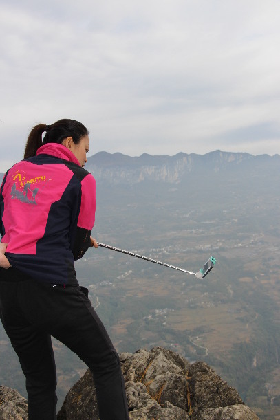 杜瑞芳被一只手用力拽着站在朝东岩绝壁上拍摄,下面是万丈深渊。