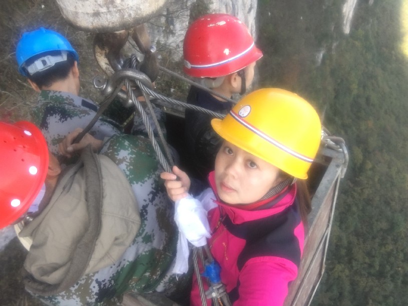 在朝东岩绝壁上,杜瑞芳坐着吊篮一点点下降到半山腰的洞口。