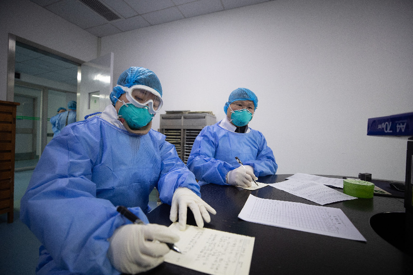 湖北日报记者李墨(左)1月26日大年初二在金银潭医院重症病区采访。
