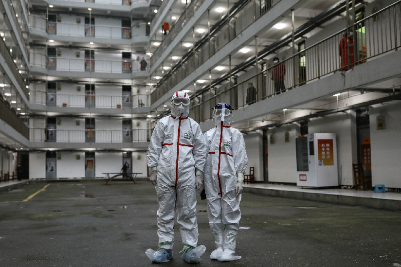 2月27日,中国青年报·中国青年网记者孙庆玲(右)在湖北省武汉软件工程学院隔离观察点采访结束后,医生给拍的照片