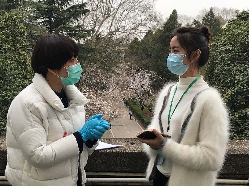 3月16日,中国青年报·中国青年网记者孙庆玲(右)在武汉大学进行武大樱花直播
