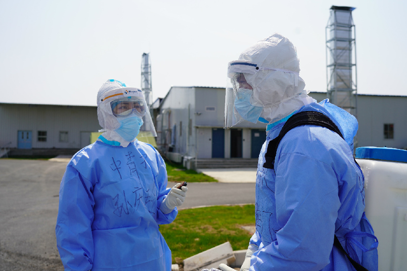 3月19日,中国青年报·中国青年网记者孙庆玲(左)在武汉火神山医院采访该院消杀队队长