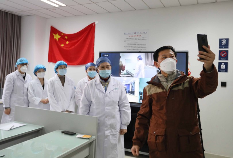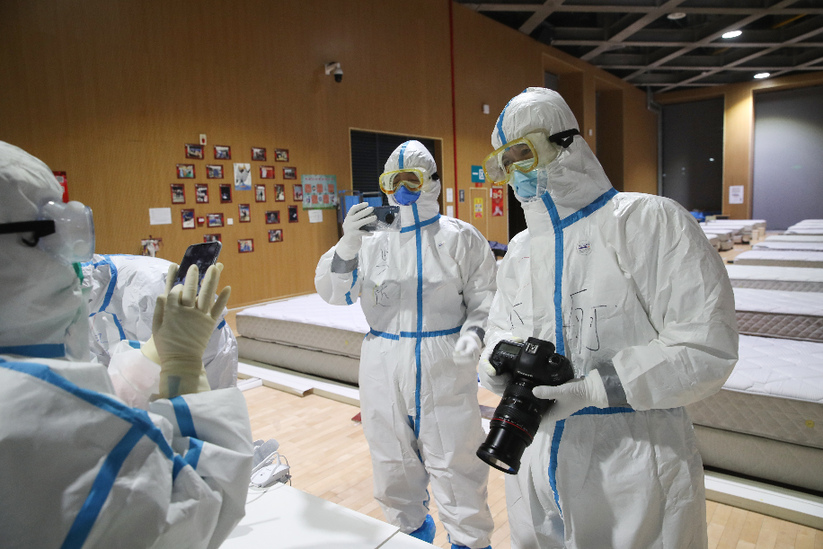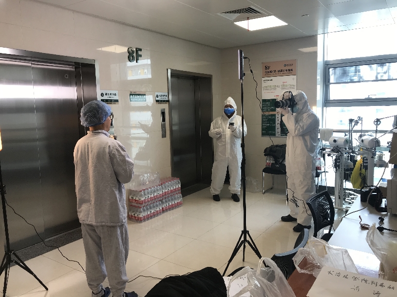 2月22日,中国摄协主席、人民日报记者李舸在武汉大学人民医院东院国家医疗队指挥中心,现场采访李兰娟院士团队。并为他们录制短视频。刘宇摄