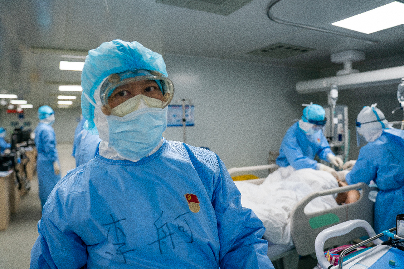 李舸在武汉火神山医院重症病房里采访拍摄。