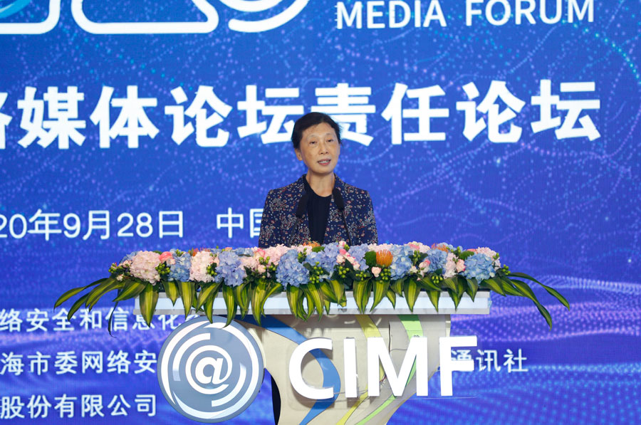 中国传媒大学新闻传播学部学部长高晓虹在2020中国网络媒体论坛责任论坛上做主题演讲。新华网 陈杰 摄