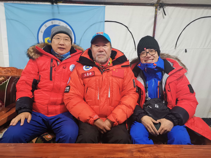 谷业凯(右)与中国登山队队长王勇峰(中)、人民日报记者袁泉(左)登顶前夜在珠峰大本营。