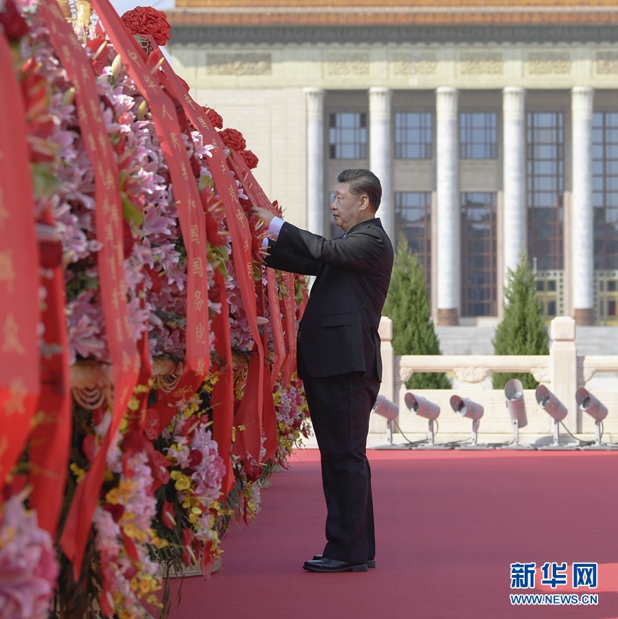9月30日上午,党和国家领导人习近平、李克强、栗战书、汪洋、王沪宁、赵乐际、韩正、王岐山等来到北京天安门广场,出席烈士纪念日向人民英雄敬献花篮仪式。这是习近平整理花篮上的缎带。 新华社记者 申宏 摄