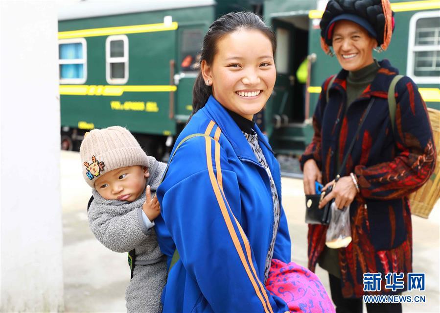 9月28日,5633次“小慢车”抵达月华站,彝族旅客背着孩子出站。 新华社发(李锴 摄)