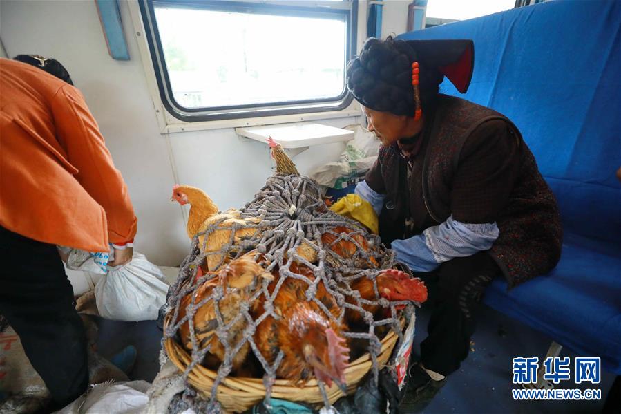 9月28日,在普雄开往攀枝花的5633次列车上,彝族老乡乘坐“小慢车”带着土鸡前往县城交易。 新华社发(李锴 摄)