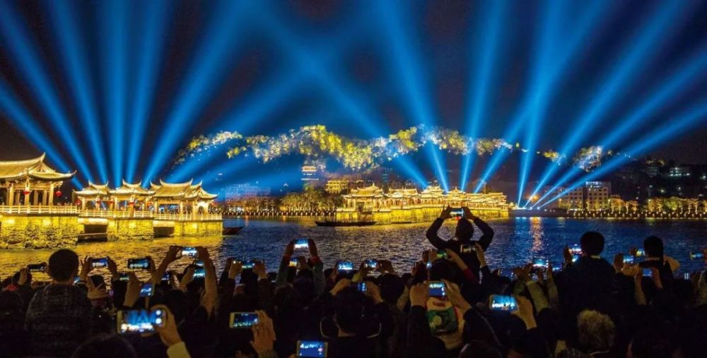 市民和游客欣赏韩江上的灯光秀表演。新华社发 张伟雄 摄