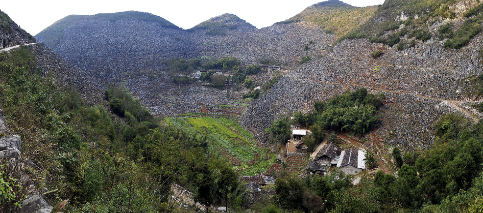 西畴县是全省乃至全国石漠化最严重的地区之一,99.9%的面积属于山区,石漠化面积占75.4%,生存发展环境极为恶劣。图为1991年被石漠化包围的村庄——西洒镇么洒村委会大邬麻村小组。(吕德仁摄)