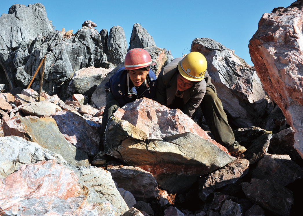 面对恶劣的生存环境,西畴人民“地瘦要垒埂,人穷要发狠”,用錾子一点一点凿,用大锤一锤一锤敲,用双手一处一处刨,建成了“保水、保土、保肥”的三保台地。图为2010年蚌谷乡长箐片区群众正在实施土地整治。(吕德仁摄)