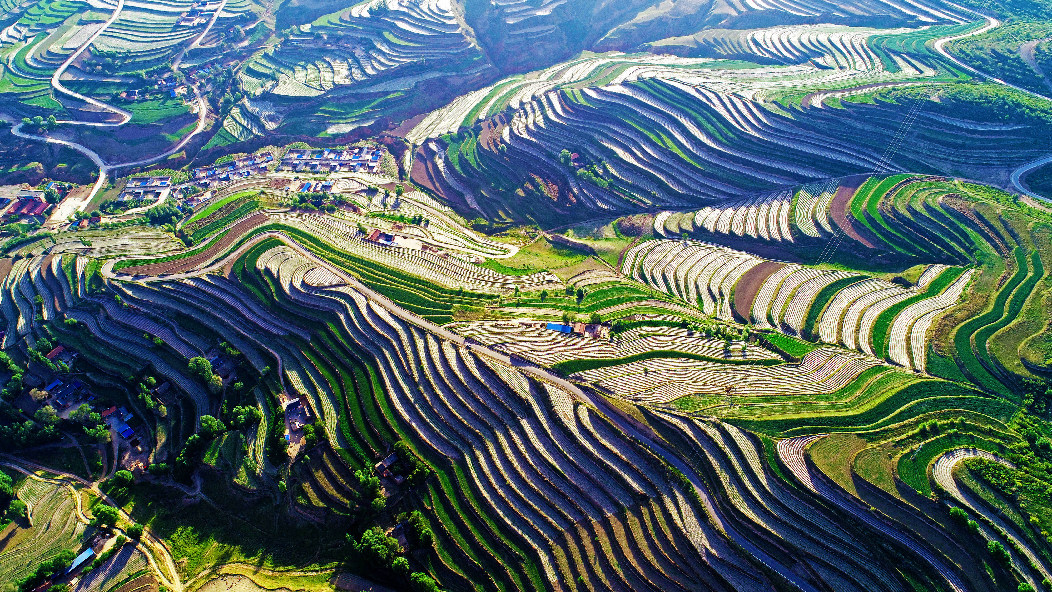 2019年6月9号拍摄于宁夏西吉县偏城乡上马村。早上的太阳刚刚升起,照在薄膜地上犹如一道道发光的银线,旱作梯田经过改良,壮观而又美丽。(蔡全录摄)