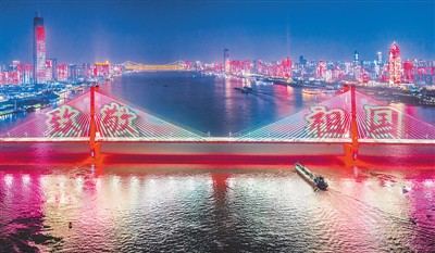 10月8日晚,湖北武汉长江二桥上演“致敬祖国”长江大型灯光秀。赵广亮摄(人民图片)