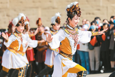 10月1日,以“唱响民族团结主旋律,谱写和谐发展新篇章”为主题的第二十一届呼和浩特昭君文化节在呼和浩特市昭君博物院开幕。图为开幕式表演。丁根厚摄(人民图片)