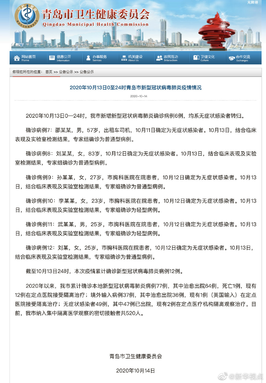 2020年10月13日0—24时,青岛市新增新型冠状病毒肺炎确诊病例6例,均系无症状感染者转归。