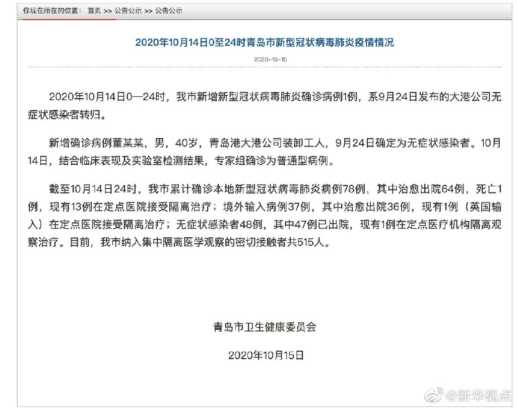 2020年10月14日0—24时,青岛市新增新型冠状病毒肺炎确诊病例1例,系9月24日发布的大港公司无症状感染者转归。