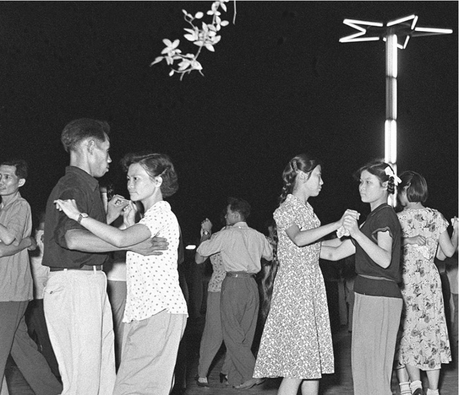 1960年7月15日发,周末之夜,在成都市中心的人民公园里,被“七里香”、蔷薇花所缭绕的露天舞池,跳舞爱好者们正在欢舞(新华社记者孙忠靖、黄陆衡/摄)