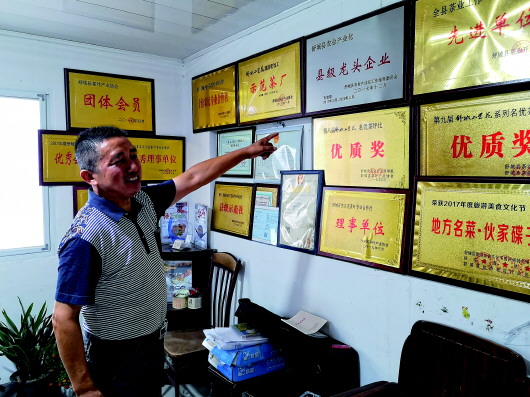 舒城县五显镇石关兰花茶叶专业合作社负责人龚世存向记者展示合作社获得的荣誉(8月29日摄)。