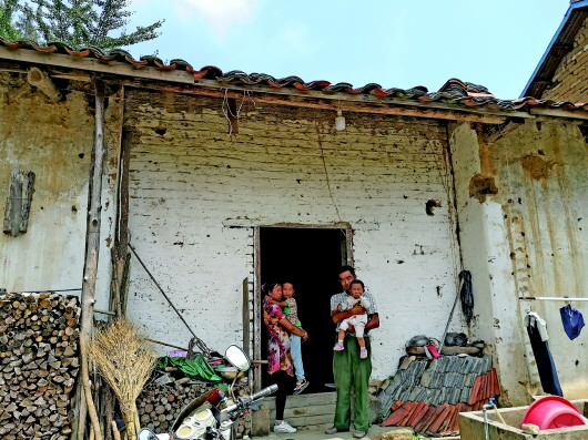 苏平村珓子石组茶农余本高一家四口站在老房子门前(8月29日摄)。
