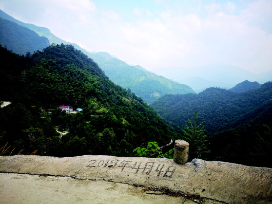 晓天镇通往山上苏平村珓子石组的水泥路上刻着修路完工的日期(8月29日摄)。本报记者蒋彤摄